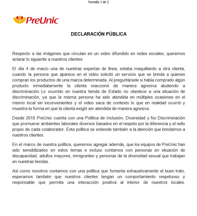 “El día 4 de marzo una de nuestras expertas de línea, estaba maquillando a otra clienta, cuando la persona que aparece en el video solicitó un servicio que se brinda a quienes compran los productos de una marca determinada. Al preguntársele si había comprado algún producto inmediatamente la clienta reaccionó de manera agresiva aludiendo a discriminación. Lo ocurrido en nuestra tienda de Estado no obedece a una situación de discriminación, ya que la misma persona ha sido atendida en múltiples ocasiones en el mismo local sin inconvenientes y el video saca de contexto lo que en realidad ocurrió y muestra la forma en que la clienta exigió ser atendida de manera agresiva”, reza el comunicado de Pre-Unic.