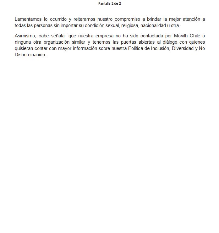 “Nuestra empresa no ha sido contactada por Movilh Chile o ninguna otra organización similar y tenemos las puertas abiertas al diálogo con quienes quisieran contar con mayor información sobre nuestra Política de Inclusión, Diversidad y No Discriminación”, precisaron.