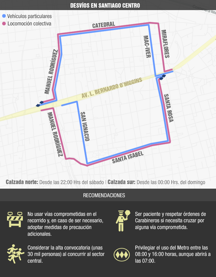 Conoce las calles por donde pasará la prueba en sus distintas categorías y la zona del centro de Santiago que permanecerá cerrada hasta el fin de la competencia.