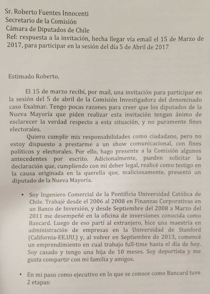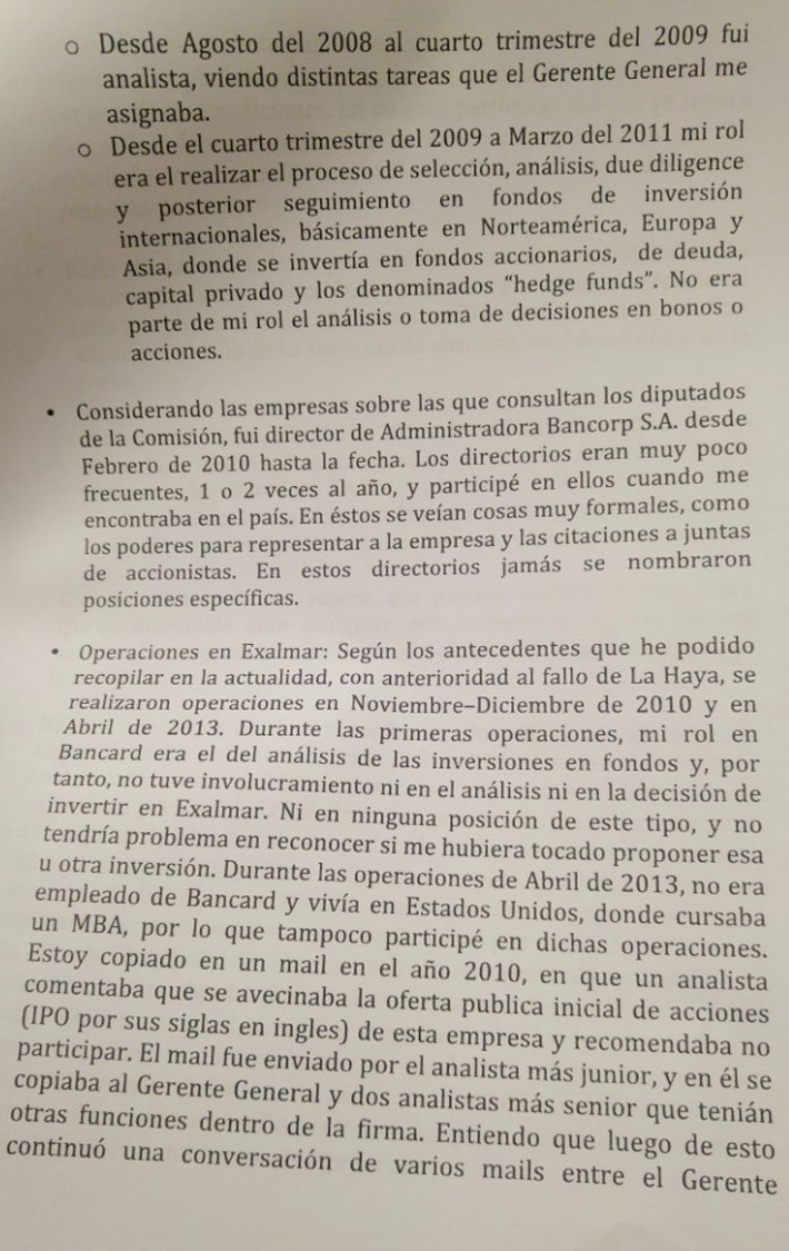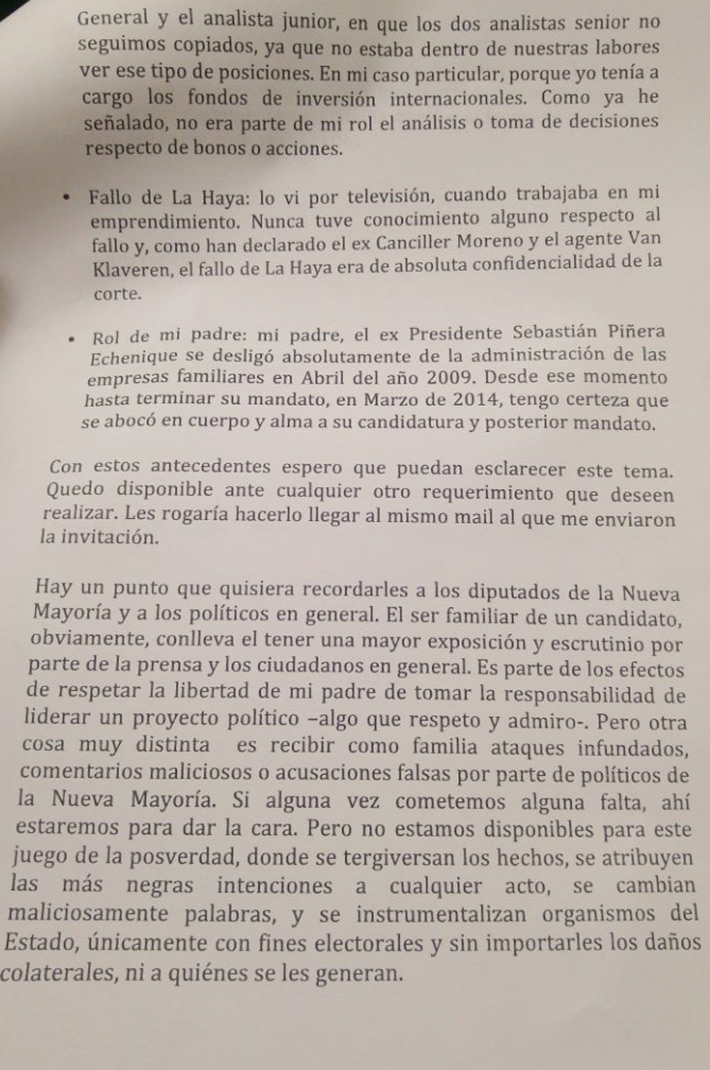 "Hago presente a la comisión algunos antecedentes por escrito. Adicionalmente, pueden solicitar la declaración que, cumpliendo con mi deber legal, realicé como testigo en la causa originada en la querella que, maliciosamente, presentó un diputado de la Nueva Mayoría", agrega.