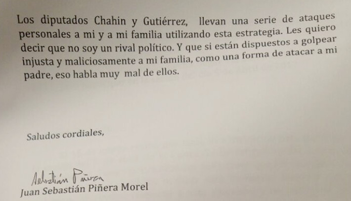 "Hay un punto que quisiera recordarles a los diputados de la Nueva Mayoría y a los políticos en general. El ser familiar de un candidato, obviamente, conlleva el tener una mayor exposición y escrutinio por parte de la prensa (...) pero otra muy distinta es recibir como familia ataques infundados, comentarios maliciosos o acusaciones falsas por parte de políticos de la Nueva Mayoría".