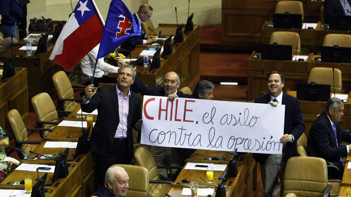 SANTIAGO.- Un lienzo con la frase "Chile, el asilo contra la opresión", levantaron los diputados miembros de la bancada de la Democracia Cristiana al interior del Hemiciclo en plena sesión parlamentaria.
