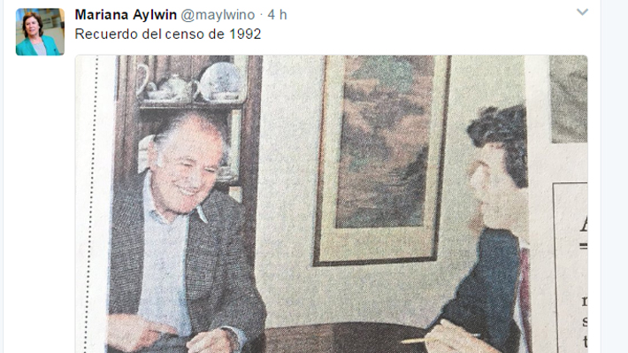 SANTIAGO.- "Recuerdo del censo de 1992". La ex ministra Mariana Aylwin tuiteó esta frase acompañada con una foto de su fallecido padre, el ex Presidente Patricio Aylwin, en una jornada especial para su familia y la Democracia Cristiana: La conmemoración de un año de su deceso.