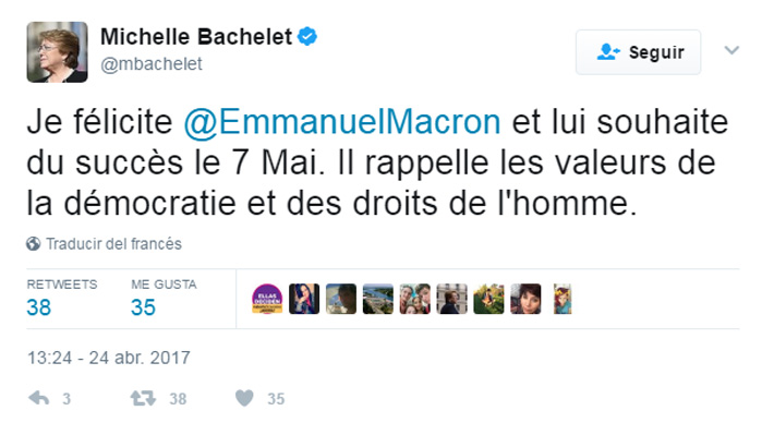 SANTIAGO.- Escribiendo en francés, la Presidenta Michelle Bachelet felicitó al candidato presidencial francés Emmanuel Macron, quien accedió a la segunda vuelta y se medirá con Marine Le Pen, del ultraderechista Frente Nacional, el próximo 7 de mayo.