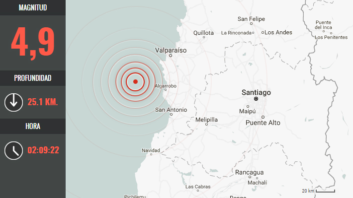 Según información del Centro Sismológico Nacional el movimiento telúrico fue de 4,9 Richter con epicentro a 34 kilómetros kilómetros al Noreste de El Tabo, con una profundidad de 25.1 km.