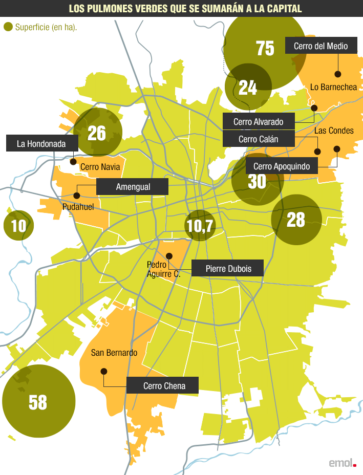 Lo Barnechea, Las Condes y San Bernardo son las comunas que ganarán más hectáreas de áreas verdes en los próximos años. En total, ocho nuevos parques sumarían 261 hectáreas de esparcimiento en la capital.