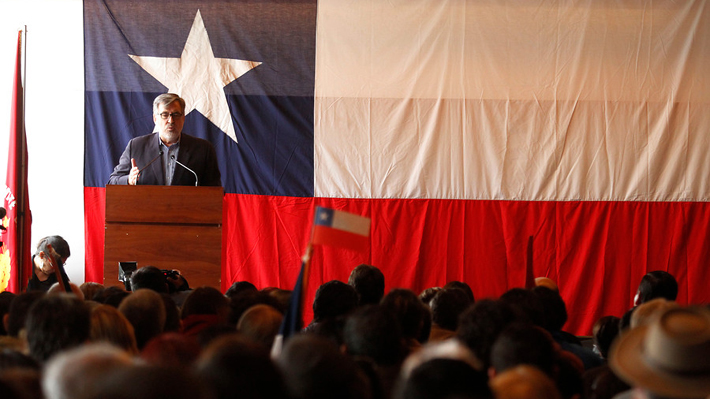 El candidato Guillier hablando frente a los militantes PC que llegaron a su proclamación.