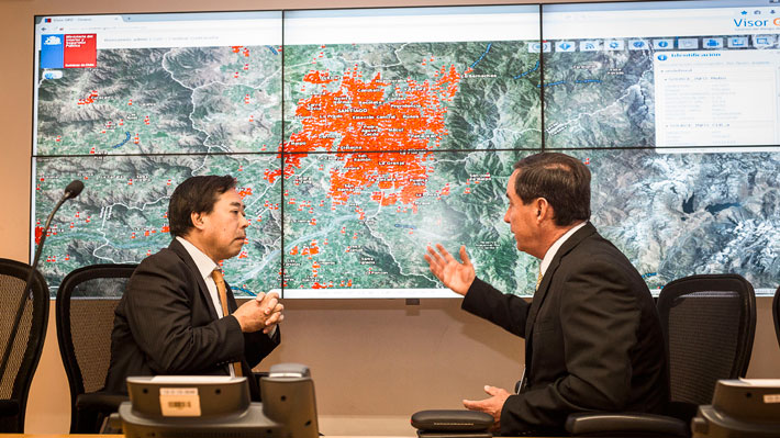 El embajador de Japón en Chile, Yoshinobu Hiraishi, y el director de la Onemi, Ricardo Toro, se reunieron ayer en la "sala de crisis" de la institución para discutir los alcances de la cooperación entre ambos países.