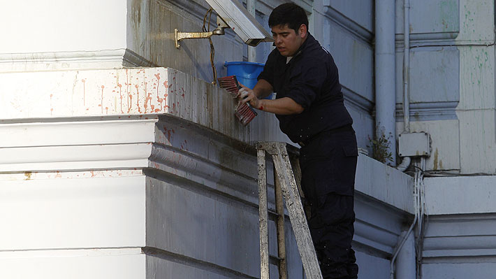 Además, efectivos de la Armada se encuentran en el lugar con escaleras y escobas intentando quitar las manchas que quedaron producto de la acción de encapuchados.