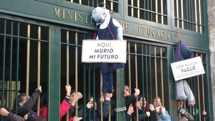 En el lugar desplegaron lienzos con la leyenda: "Sucursal de la educación de mercado" y "No más CAE". También colgaron en las rejas muñecos vestidos de escolares, que portaban letreros que decían: "Aquí murió mi futuro" y "Con mi vida pagué".