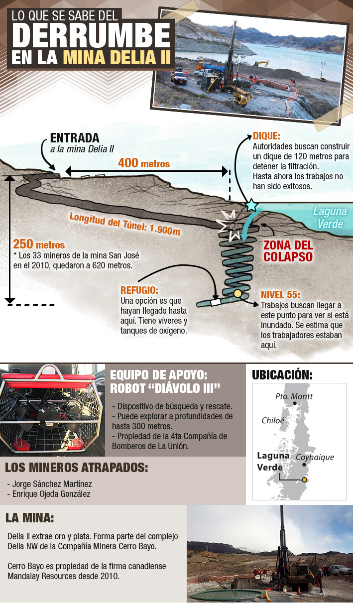 SANTIAGO.- Desde el viernes, dos trabajadores del yacimiento Delia 2 de Chile Chico, permanecen atrapados luego de que una fisura en las paredes de la mina comenzara a filtrar agua desde la Laguna Verde.
