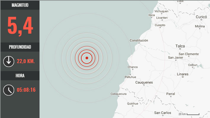 SANTIAGO.- Un sismo de mediana intensidad se registró durante la mañana de este miércoles en la zona centro sur del país, el que alcanzó los 5,4 Richter, según informó el Centro Sismológico Nacional.