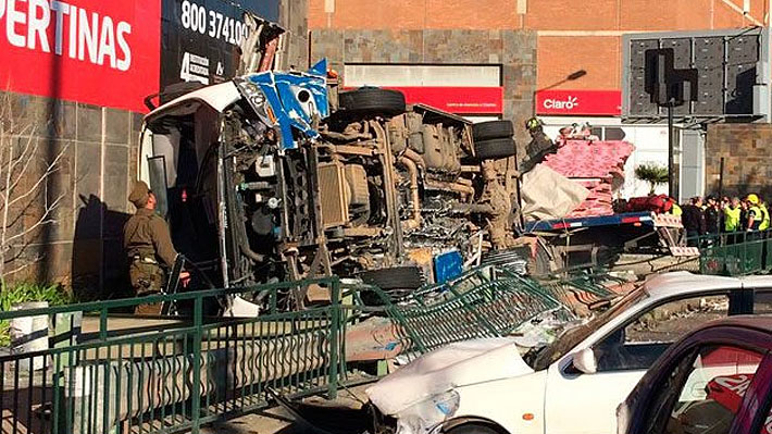El hecho se produjo alrededor de las 09:00 horas de hoy cuando el camión cargado con materiales de construcción bajaba por la avenida Alessandri y, al parecer por el corte de frenos, el chofer perdió el control y colisionó primero con un bus, que volcó sobre la acera, y después con otros tres vehículos menores.