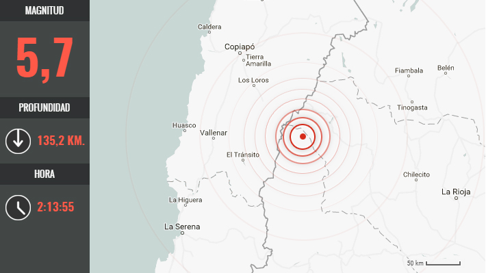 SANTIAGO.- Un sismo de 5,7 en la escala de Richter se sintió durante la madrugada de este martes en las regiones de Atacama y Coquimbo.