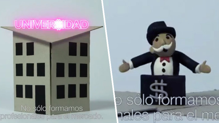 Luego ese edificio se abre y aparece "Mr. Monopoly", mientras una voz en off afirma que las universidades estatales no sólo forman "profesionales para el mercado", sino que "ciudadanos".
