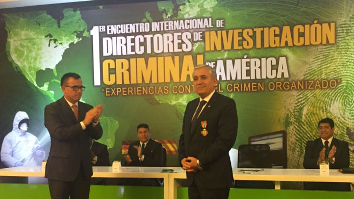 SANTIAGO.- En el marco de la participación de la Policía de Investigaciones en el 1° Encuentro Internacional de Directores de Investigación Criminal de América, el director general de la PDI, Héctor Espinosa, recibió la más importante condecoración que entrega la Policía Nacional de Colombia por el trabajo comprometido de la policía civil chilena en el combate contra el narcotráfico y la delincuencia organizada que atenta contra la comunidad nacional e internacional.