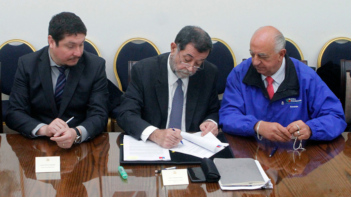 Aleuy (centro) firmando el protocolo con los alcaldes de Macul (izq) y de Villa Alemana.