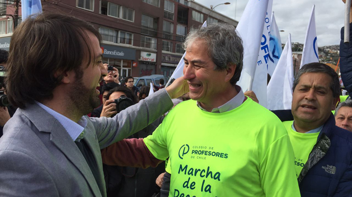 Los dirigentes del Magisterio, encabezados por su presidente, Mario Aguilar (PH), arribaron hoy a Valparaíso, donde fueron recibidos por el alcalde de la ciudad, Jorge Sharp (MA).