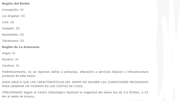 Asimismo, el SHOA indicó que las características del sismo no reúnen las características necesarias para generar un tsunami en las costas del país.