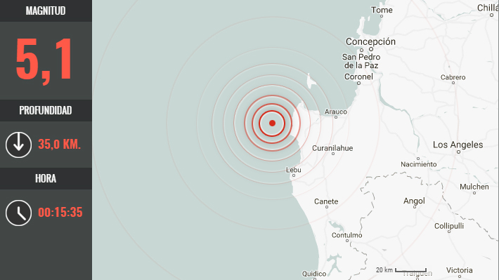 El Centro Sismólogico Nacional informó que el epicentro fue 39 kilómetros al noroeste de Lebu, tuvo una profundidad de 35 kilómetros y se percibió a las 00:15 horas.