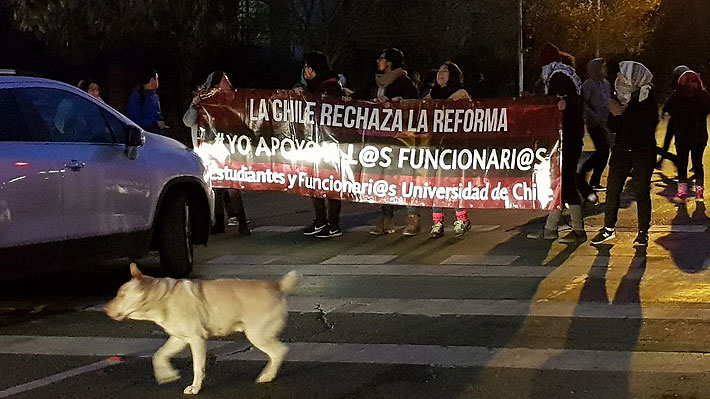 "La Chile rechaza la reforma #Yo apoyo l@s funcionarios. Estudiantes y funcionari@s Universidad de Chile", se lee en uno de los lienzos que sostienen los jóvenes al medio de la calle.