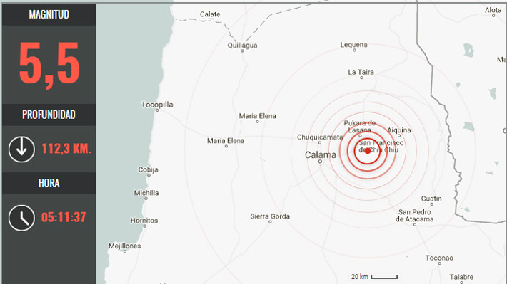 Según la información brindada por el Centro Sismológico Nacional, el movimiento telúrico alcanzó una magnitud de 5,5 y su epicentro se ubicó a 41 kilómetros al Este de la ciudad de Calama. En tanto, se registró a una profundidad de 112 kilómetros.