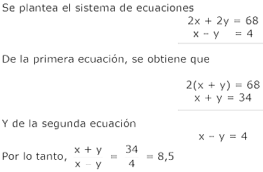El doble de un número x más el doble de otro número y es igual a la mitad de 136, y la diferencia de x sobre y es igual a 4. ¿Cuál es la razón entre la suma de x e y y la diferencia positiva entre ambos números?