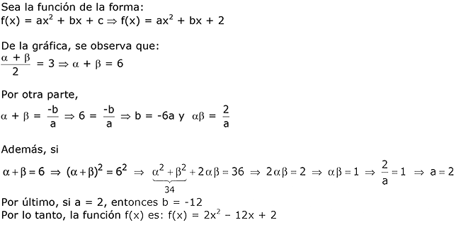 ¿Cuál es la función cuadrática que corresponde a la gráfica de la figura adjunta, si 2 + 2 = 34, donde y son los ceros de la función y (3,k) es el vértice de la parábola asociada a la función f(x)?
