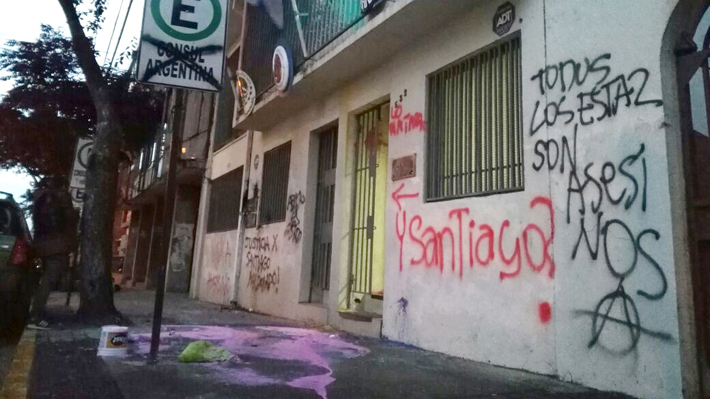 SANTIAGO.- La tarde de este viernes un ataque con rayados y lanzamiento de bombas de pintura sufrió el consulado argentino en Concepción, Región del Bío Bío pidiendo justicia por el activista mapuche, Santiago Maldonado.