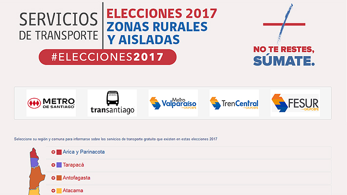 Además, el Gobierno ha dispuesto la página web www.transporteelecciones2017.cl para que se informe de horarios, frecuencia y todo lo que se necesite para trasladarse en la presente jornada.