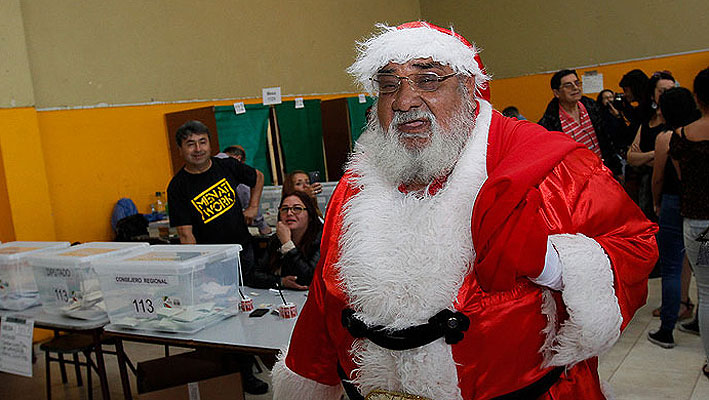 Poco importaron las altas temperaturas que esta tarde se registraron en la zona central del país, ya que Rigoberto Martínez nuevamente se vistió de "Viejo Pascuero" para celebrar estos comicios. El hombre, que hace 16 años dio inicio a esta tradición, llegó con su tradicional traje navideño al Colegio Carlos Cousiño de Valparaíso.
