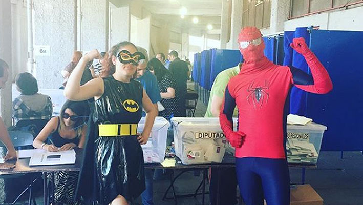 Como parte de una prueba de alianza de su colegio, dos jóvenes asistieron hasta el Estadio Nacional disfrazados de superhéroes. Esta fue la primera vez que ambos pudieron ejercer su derecho a voto.