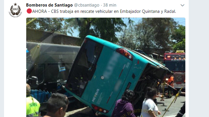 El comandante de Carabineros Jorge Muñoz comentó que la máquina de la empresa Metbus volcó tras ser impactado por un camión tolva, el que se habría pasado una señal de ceda el paso.