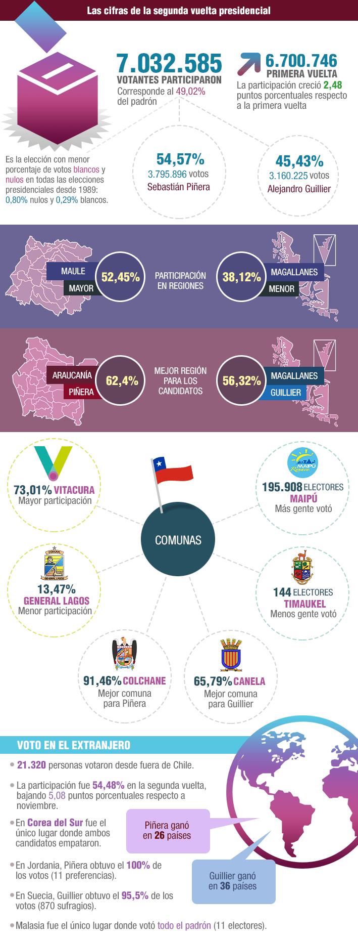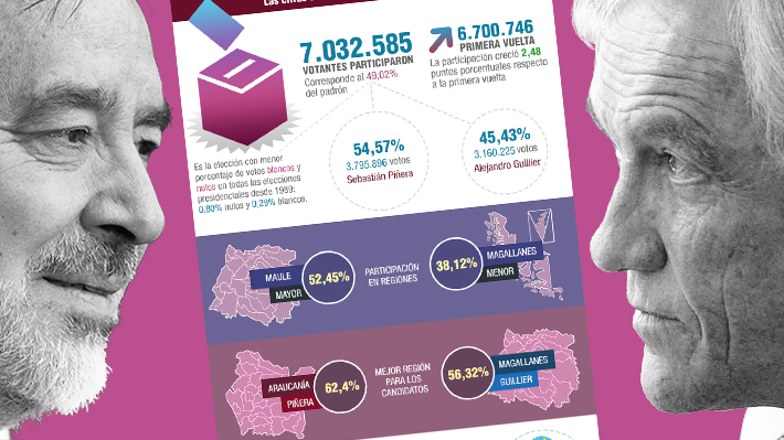Conoce los números que dejó el balotaje que le dio a Sebastián Piñera la victoria sobre Alejandro Guillier para iniciar su segundo gobierno en La Moneda.