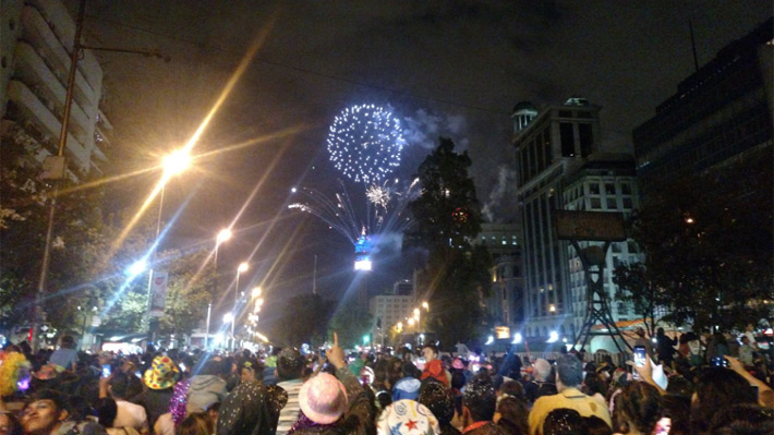 Los festejos partieron poco antes de las 12:00 horas con el tradicional show pirotécnico en la Torre Entel, en Santiago centro, con algunos reclamos de los asistentes porque no hubo este año cuenta regresiva.