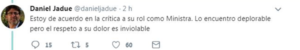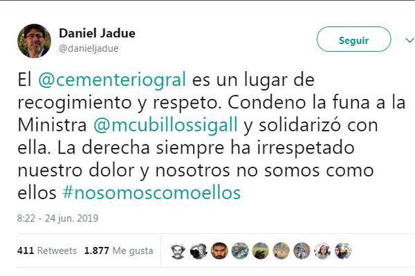 Además del rechazo del Gobierno por esta "funa", se sumaron voces opositoras, como la del alcalde de Recoleta, Daniel Jadue (PC), quien esta mañana tuiteó: "El cementerio general es un lugar de respeto. Condeno la funa a la ministra Cubillos y solidarizo con ella".