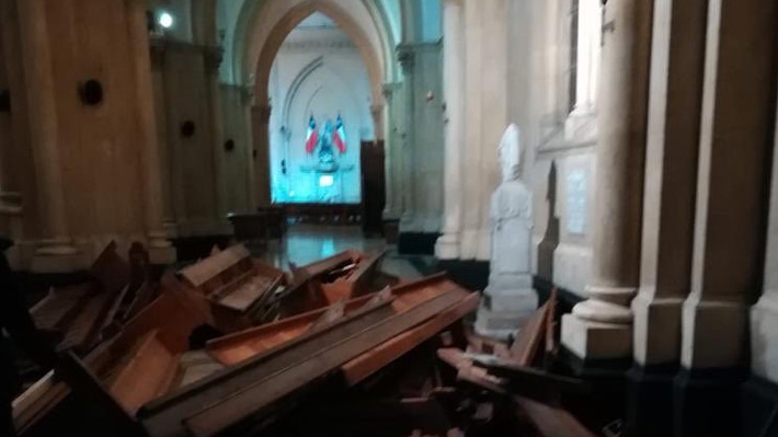 Durante la noche del sábado, la primera sin toque de queda en Valparaíso, un grupo de personas forzó las puertas de la catedral de la región, sustrajo sus bancas, y formó barricadas con ellas.