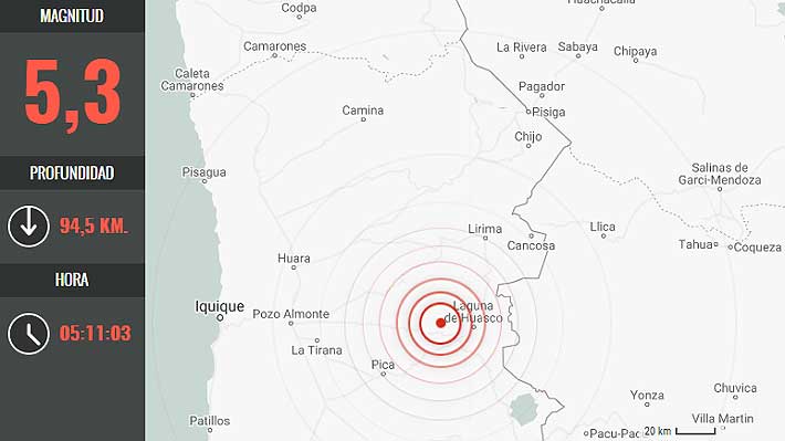 Según el Centro Sismológico Nacional (CSN) el movimiento tuvo una magnitud de 5,3 Richter, se produjo a 33 kilómetros al noreste de Pica a una profundidad de 94,5 kilómetros.