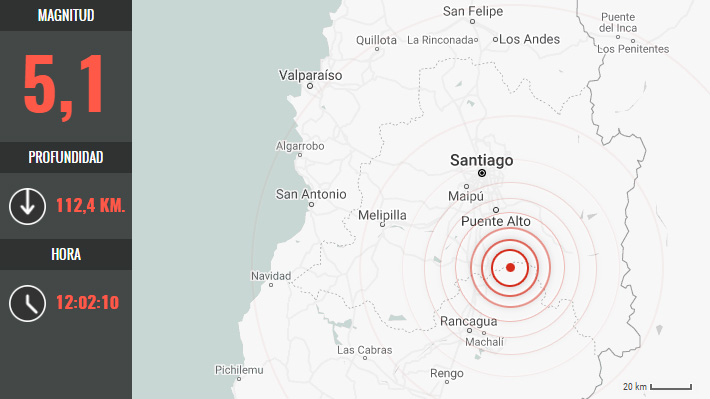 En tanto de acuerdo al Centro Sismológico Nacional de la Universidad de Chile, el temblor tuvo una magnitud de 5,1, y se originó a una profundidad de 113 kms, con epicentro 9 km al SO de San José de Maipo.