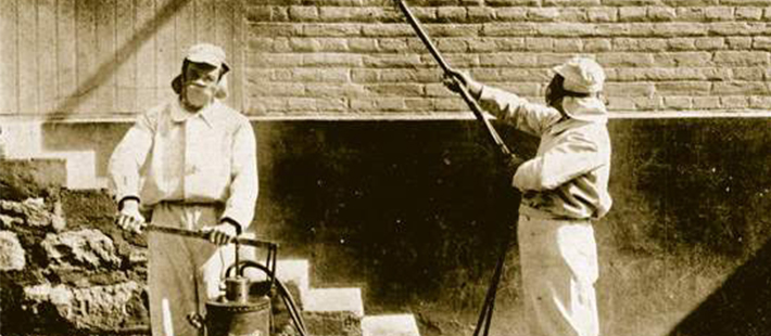 Desinfectadores trabajando, hacia 1910, compilado por Pedro Lautaro Ferrer. Foto: Memoria Chilena.