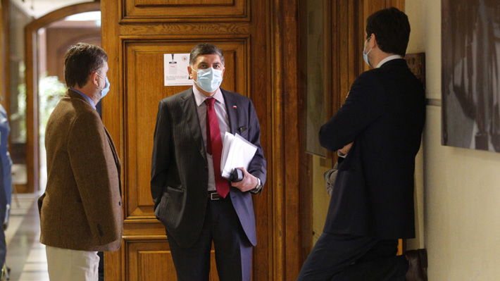 El ministro de la Segpres, Claudio Alvarado, está en el Congreso siguiendo el debate. En la foto conversa con el presidente y el vicepresidente de la Cámara.