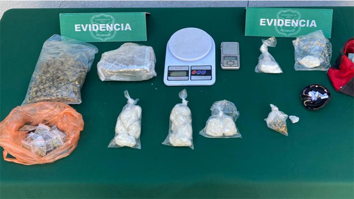 En el lugar de la comuna de Cerrillos se incautaron 423 gramos de marihuana, 260 gramos de pasta base de cocaína y 35 gramos de clorhidrato de cocaína.