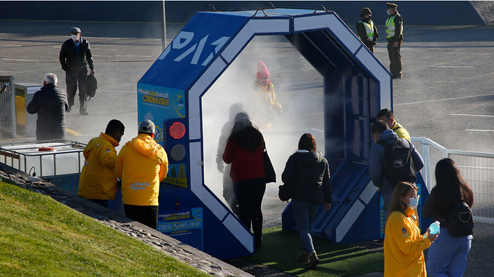 Un túnel sanitizador a la entrada de metro Plaza de Maipú.