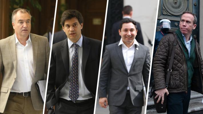 El presidente de Evópoli, Andrés Molina, el jefe de la bancada RN, Sebastián Torrealba, el líder del PRI, Rodrigo Caramori y el diputado UDI Jorge Alessandri.
