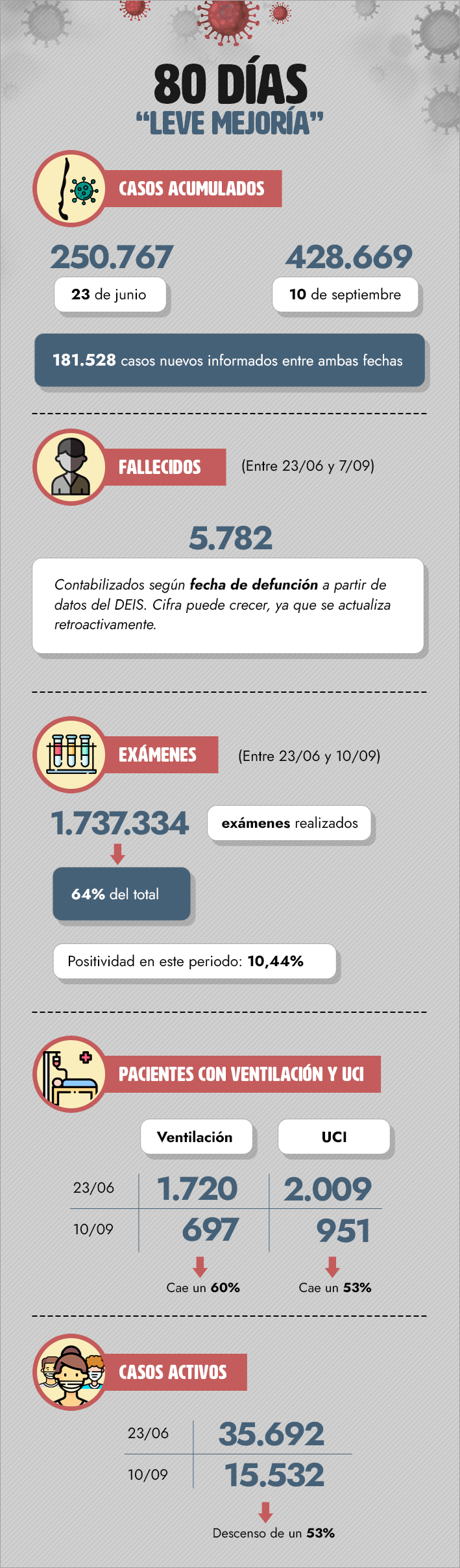 Las muertes también han ido en descenso. El llamado "peor día de la pandemia" fue el 13 de junio, con 195 muertes confirmadas por covid-19, pero al sumar PCR positivo y sospechosos, el peor día fue el 9 de ese mes, con 262 fallecidos, según cifras del Departamento de Información y Estadística (DEIS). El 13 de julio fue la última vez que los fallecidos superaron el centenar, con 104 casos.