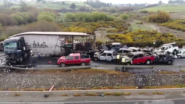 Un nuevo video del accidente ocurrido esta mañana en Victoria, en la Región de La Araucanía, comenzó a difundirse en redes sociales, el cual muestra la magnitud del choque múltiple que involucró a 18 vehículos y que ya dejó al menos dos fallecidos.