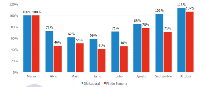"Ya en octubre ese número es 12% más alto que marzo, por primera vez tenemos un tráfico más alto que el que tuvimos cuando se iniciaron las medidas de confinamiento. Este número es muy parecido al tráfico que se tuvo en 2019, es solamente 4% más bajo que ocurre en 2019", dijo.