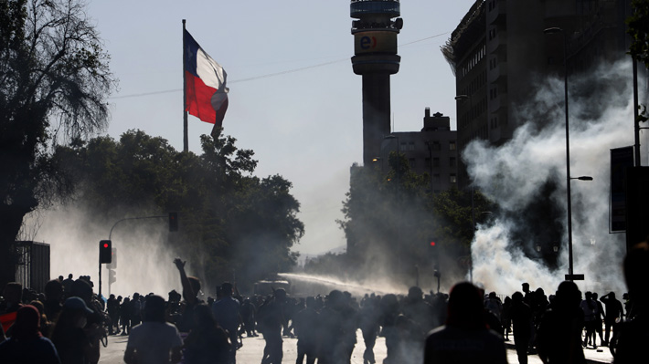 "Personal de la Prefectura Control de Orden Público detuvo a 8 sujetos por desórdenes en Santiago", comunicaron desde la institución policial, que rápidamente llegó al sector para dispersar a los manifestantes con carros lanza agua, lanza gases y uniformados a caballo.