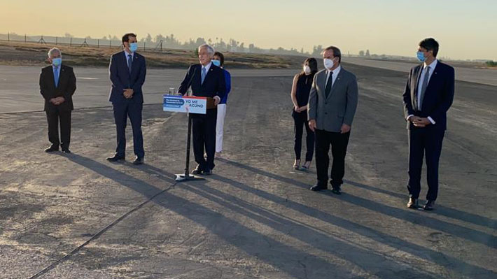 primeras 10 mil dosis de la vacuna Pfizer. En el aeropuerto de Santiago las recibió el Presidente Sebastián Piñera, acompañado de los ministros de Salud, Interior, Ciencia y de Relaciones Exteriores.