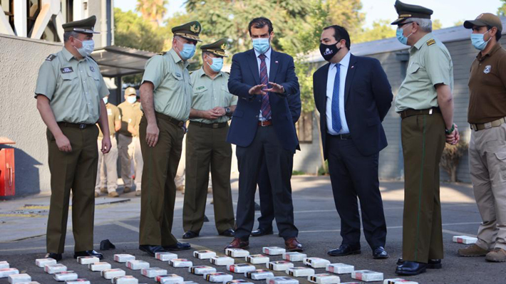 El ministro del Interior, Rodrigo Delgado, junto al general director de Carabineros, Ricardo Yáñez y el director de la Unidad de Tráfico de Drogas del Ministerio Público, Luis Toledo, valoraron este lunes el decomiso de 631 kilos de cocaína de alta pureza, que sería distribuida en la Región Metropolitana durante las fiestas de fin de año.